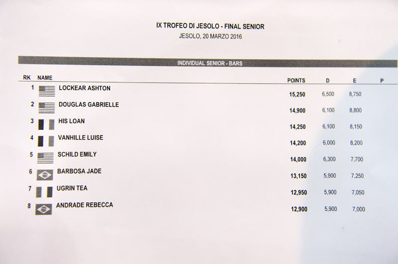 JESOLO – La nostra Azzurra, Tea Ugrin, che gareggia per la società triestina Artistica ’81, ha conquistato sabato, nel prestigioso Trofeo Città di Jesolo 2016 di ginnastica artistica, il terzo posto con la nazionale italiana nella prova a squadre piazzandosi nella prova alle parallele l’undicesimo posto. Il primo posto è andato allo squadrone USA davanti al Brasile.