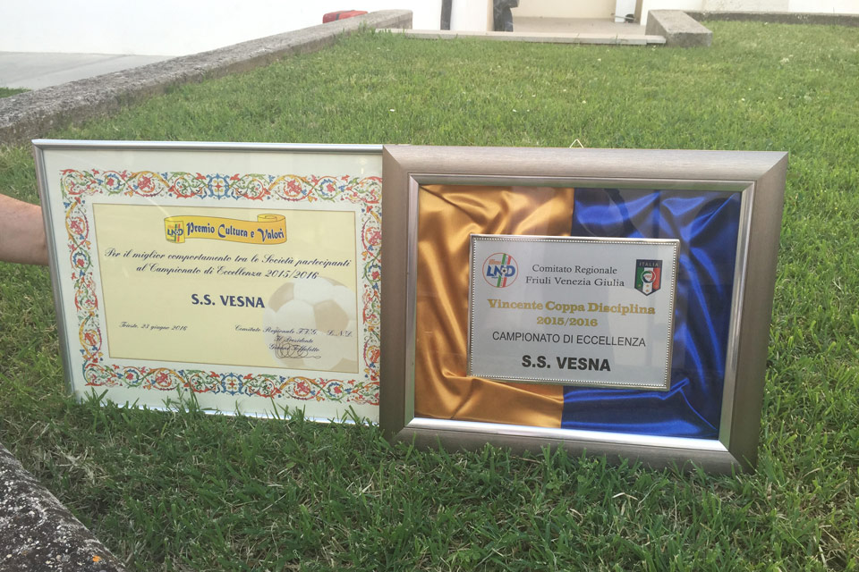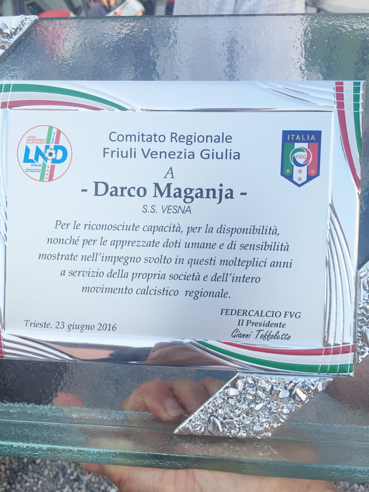 PALMANOVA – Il Consiglio Direttivo del Comitato Regionale Friuli Venezia Giulia ha giovedì 23 giugno assegnato ai Dirigenti di Società, Allenatori, Arbitri e Dirigenti Federali il riconoscimento della “Benemerenza Regionale” per i tanti anni di impegno profuso in favore del calcio dilettantistico della nostra Regione, tra i quali anche a Darko Maganja del Vesna e a Ivan Batistič del Sovodnje.