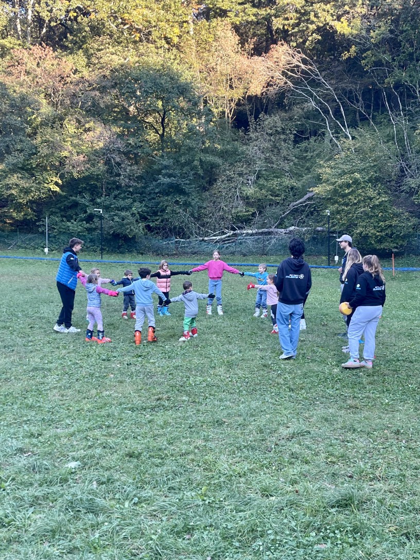 Skupino otrok učijo društveni učitelji, in sicer Luka Sedmak, Enrico Slavich in Petra Bellafontana.