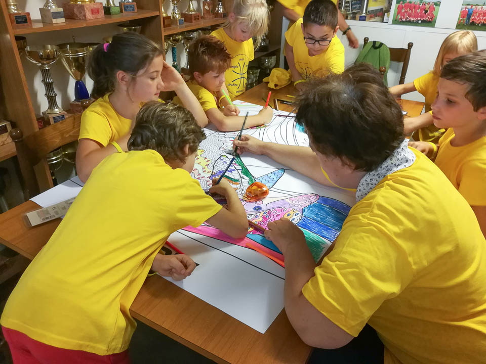 Medtem ko so v veliki telovadnici učenci 4. in 5. razredov obeh šol skakali, tekali in igrali košarko z gojenci Cesta-a, so mlajši učenci imeli v zunanjih prostorih štiri različne laboratorije in sicer: glasbenega, risalno-kreativnega, športnega in terapevtsko barvanje mandal. Za to priložnost so pred kratkim učenci tudi pripravili logo in slogan, katera sta bila nato natiskana na majico, ki so jo organizatorji priredili prav za ta dan. Slogan se je tako glasil: družina, prijatelji, ekipa. Poleg majice so vsi otroci prejeli tudi zelo lepo rumeno zapesnico.