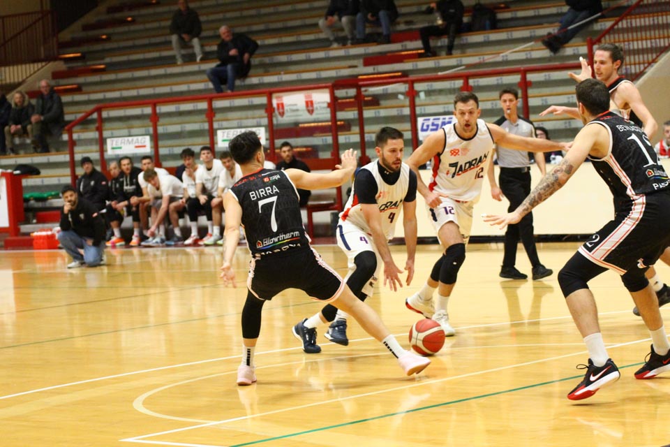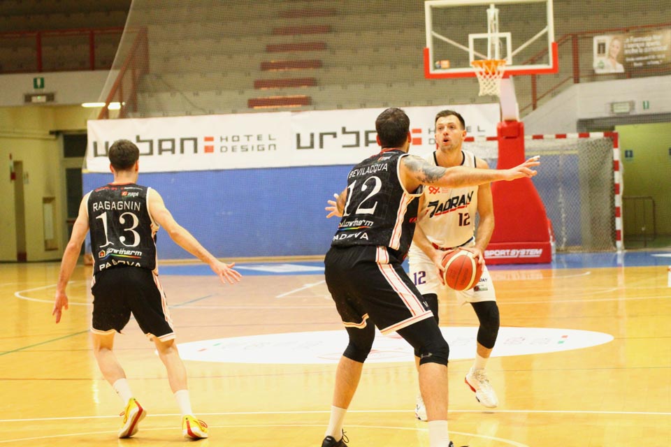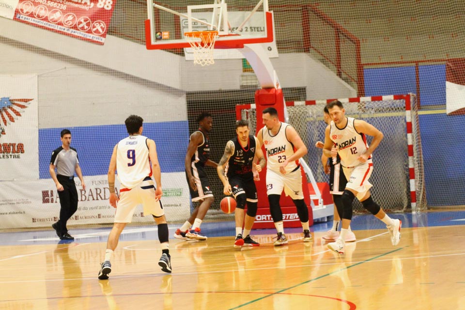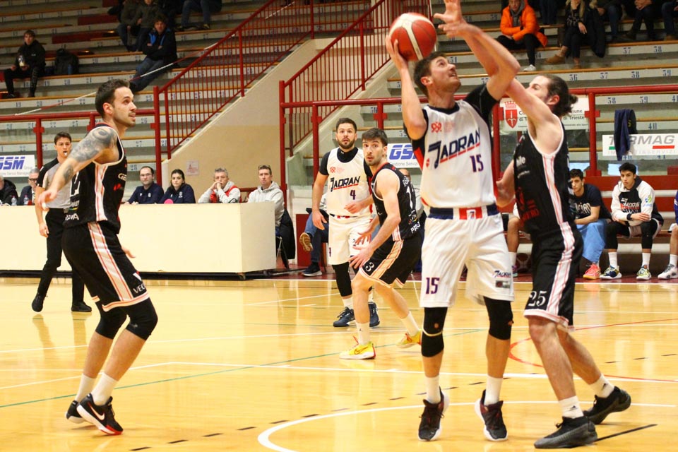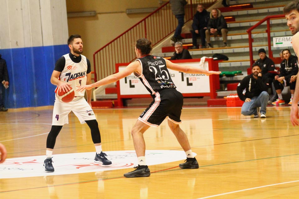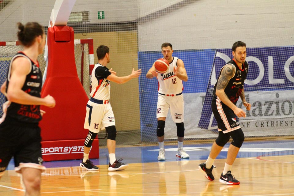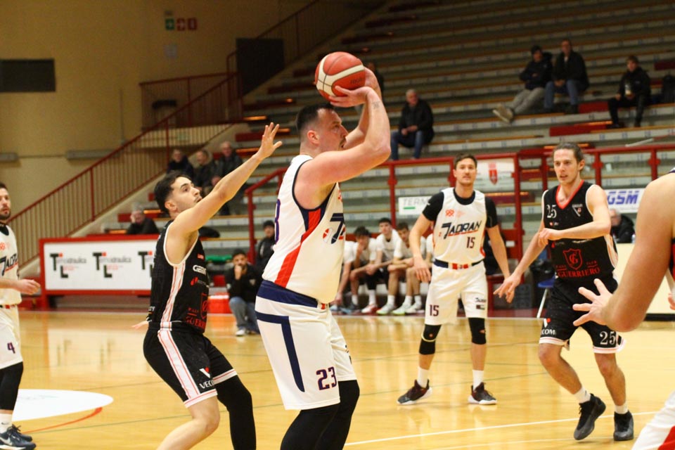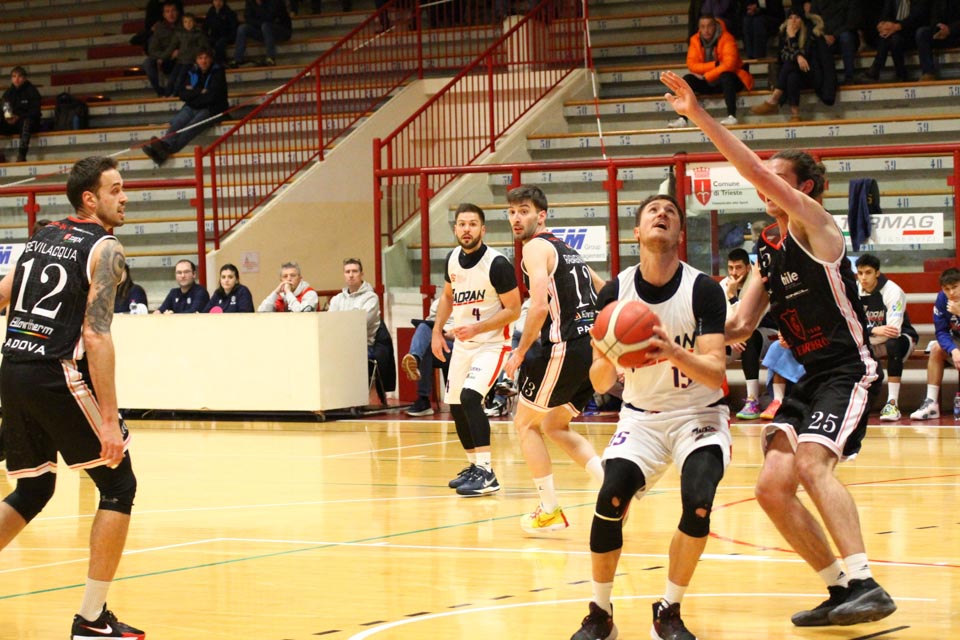 Jadranovci ostajajo tudi po 13. krogu meddeželne B-lige na predzadnjem mestu lestvice s samo dvema zmagama. Tokrat so na domačem parketu na Čarboli izgubili proti ekipi Guerriero iz Padove, ki je bila skozi vse srečanje boljša od Bazzarinijevih varovancev. Ti so se sicer enakovredno upirali v prvi četrtini, v drugi pa so so bili gostje odločno boljši, saj so prvi polčas sklenili z visokim vodstvom 17 točk. Tudi v nadaljevanju jadranovci niso odregirali, tako da je bil visok poraz neizbežen.