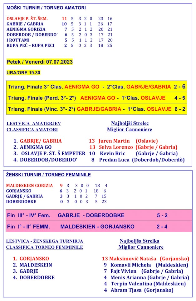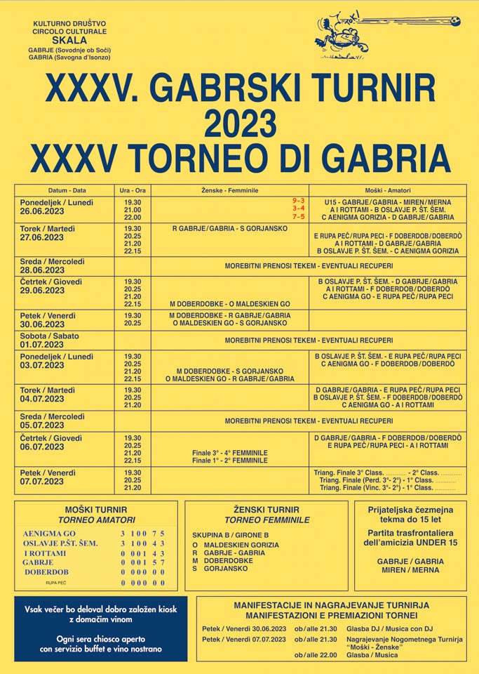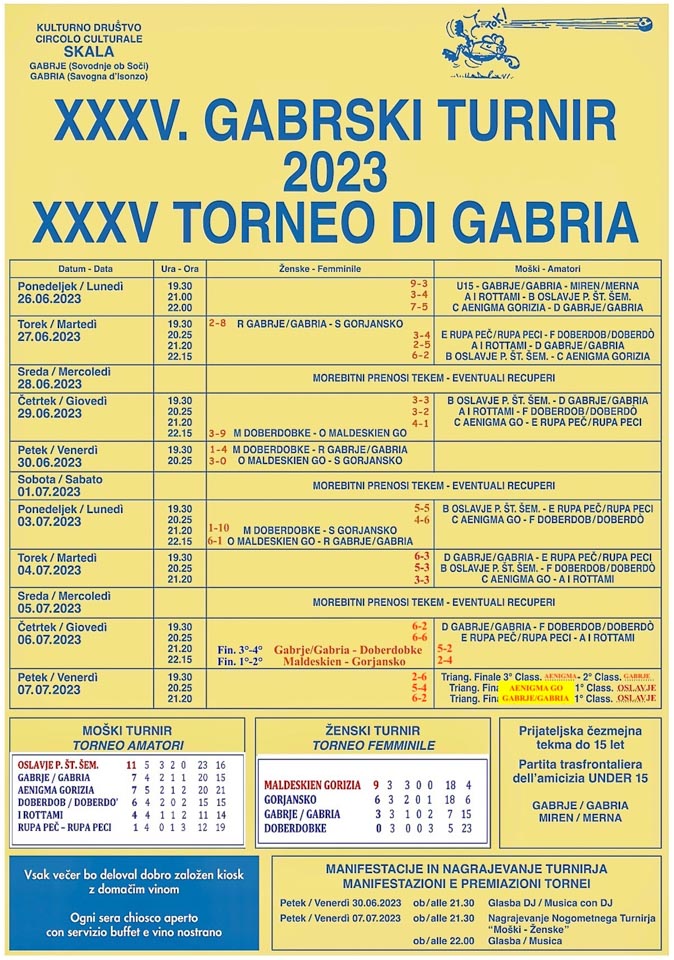Gabrski turnir se bo končal v petek, 7. julija 2023 sfinalnimi tekmami in nagrajevanjem ter nadaljeval z glasbo.