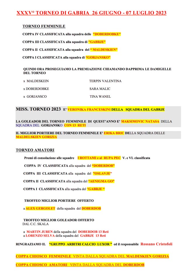GABRJE – Tradicionalni turnir v malem nogometu v Gabrjah, ki se je začel 30. junija, se je končal v petek, 7. julija 2023 s finalnimi tekmami in z nagrajevanjem.