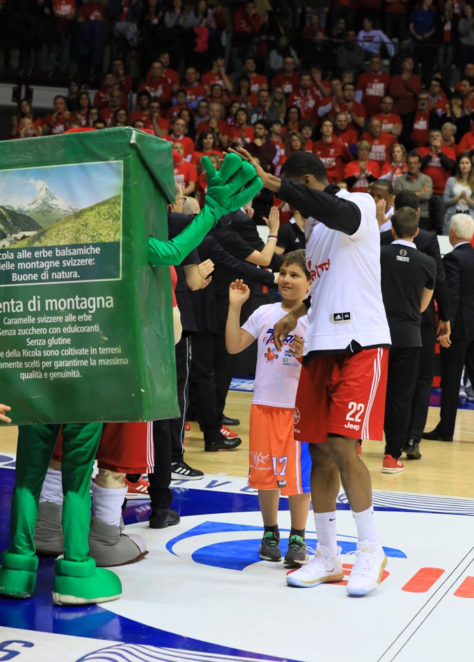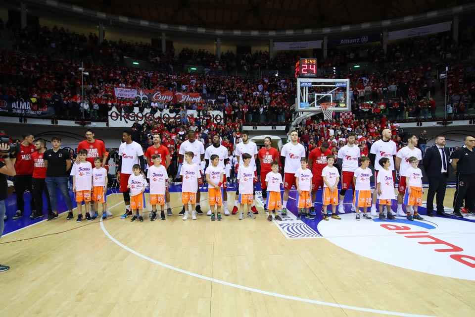 Ob tej priložnosti je 25 Jadranovih minikošarkarjev stopilo na igrišče s košarkarji tržaške Alme.